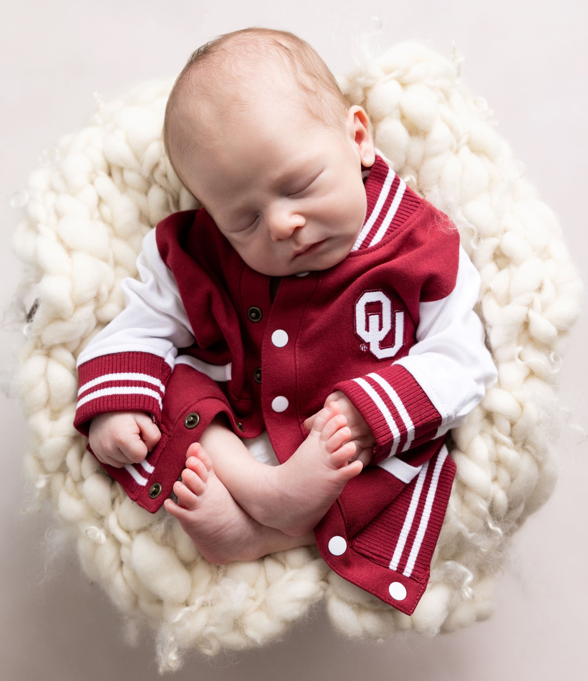 Every future OU athlete needs their varsity jacket! This lightweight, University of Oklahoma jacket will provide a little warmth for your little fan on a cold game. The snap front makes it easy to snap on and off.